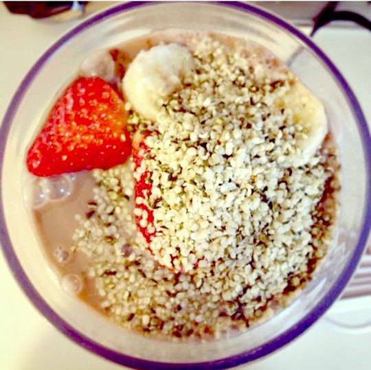 Blend the strawberries, banana, mango, powder, and almond milk together. Then, top with hemp seeds as desired!