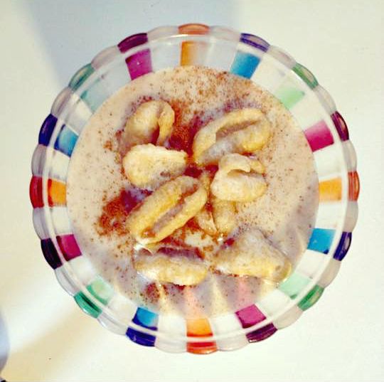 Blend the almond milk, banana, date, cinnamon, syrup (if using) and almond butter together. Top with quinoa crunchies and MORE cinnamon! Always more cinnamon! :p