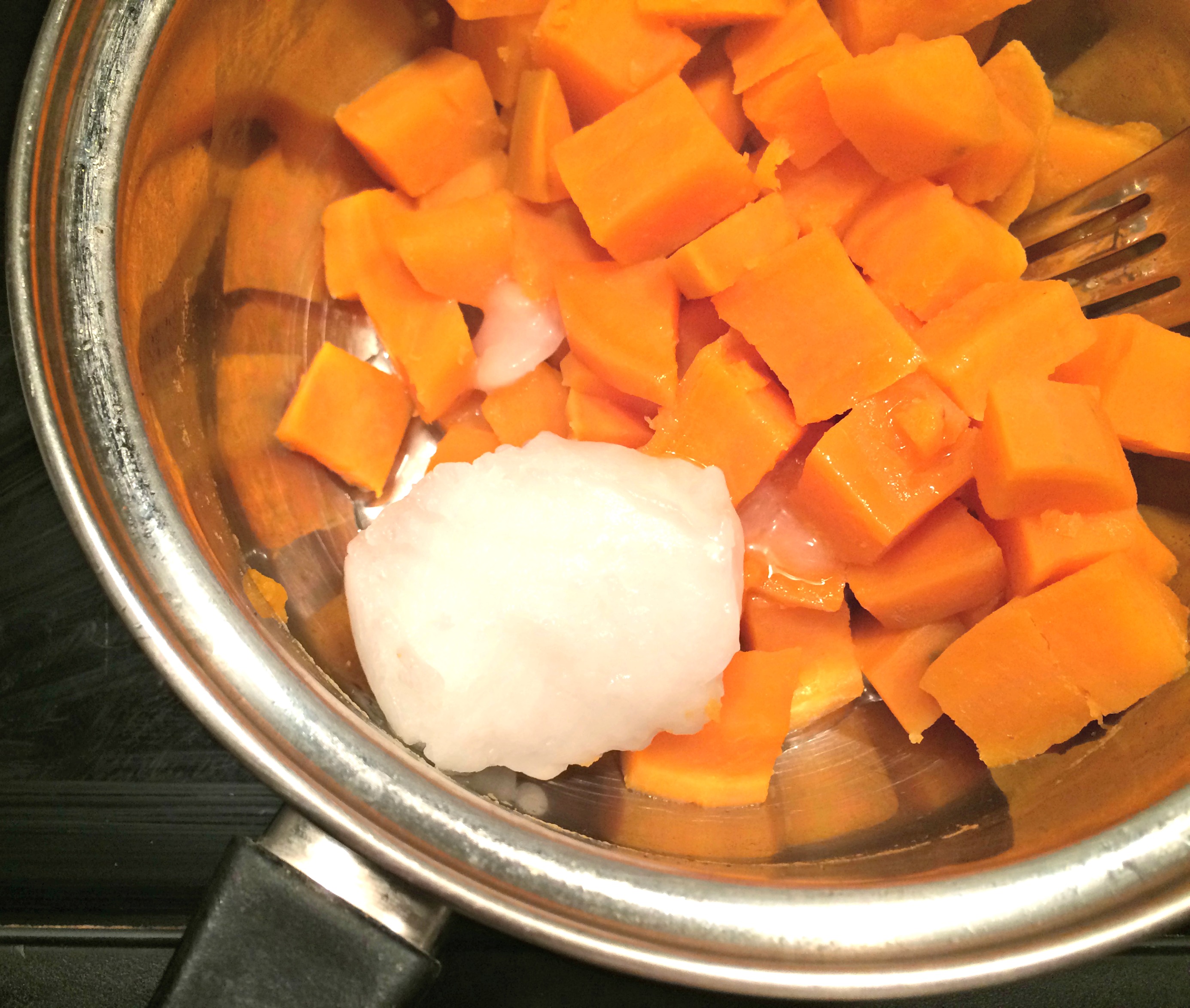 - Drain; return to pot, mash until smooth. Stir in coconut oil, vanilla, and salt.